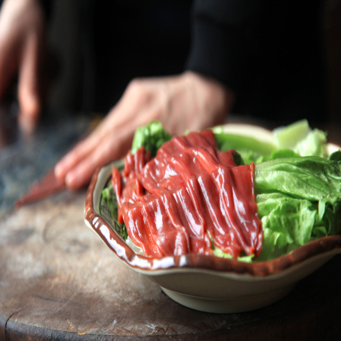 簡介:百宗雜牛場大刀肉片是重慶火鍋達人們喜愛之一,專選眉毛肉切制而成,擁有巴掌般的厚實感,需煮20分鐘左右,大刀肉片久煮不老反而棉軟醇厚,當(dāng)然這對刀工師傅的要求甚高,如果太厚在煮的時候就容易讓肉本身的鮮味流失,進而成為又柴又木的“死肉”。一般5—6毫米是老肉片最佳厚度,燙煮之瘦肉醇厚,穿插瘦肉間的肥肉形成好看的紋理,更是Q彈給力。