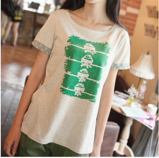 2015 夏款 日系森女休閑寬松大碼全棉拼接藍格子綠短袖T恤女 /