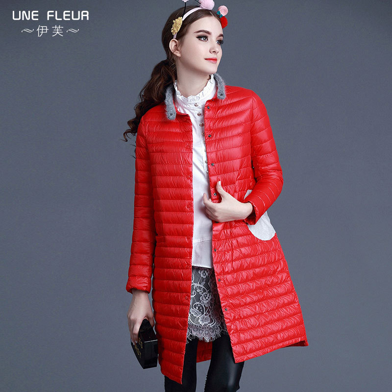 歐美女裝秋冬新品口袋拼色立領(lǐng)中長(zhǎng)款超輕薄羽絨棉服外套潮 /