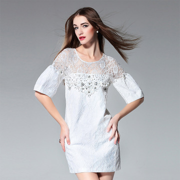 2016春季新品高端女裝連衣 歐洲站蕾絲并提花訂珠短袖裙 批發(fā) /