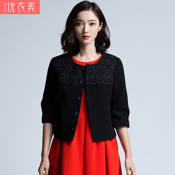 優(yōu)衣美2016春季女裝圓領(lǐng)時尚七分袖蕾絲拼接小香風(fēng)短外套女16103 /