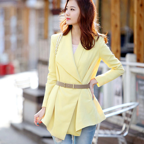 OL系列風(fēng)2今年流行鵝黃色,此款服飾就走流行線路,以黃色為主打色,簡約清新的設(shè)計,打破了西裝外套對稱領(lǐng)兒,選用了不對稱不規(guī)則的方法,讓本來呆板、正式的服飾多了一點時尚的感覺。尤其是腰間搭配的卡其色腰帶,讓愛美的你顯得更端莊、身材更高挑。