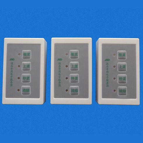 金尚德催菜系統(tǒng):一般安裝在酒店的各個(gè) 房間里,也可以安裝在各個(gè)餐桌附近。便于顧客或服務(wù)員直接操作,用來(lái)通知廚房(或者上菜組)表達(dá)該房間顧客的要求。在同一主機(jī)控制下的各個(gè)控制器編碼不能 一樣(見撥碼開關(guān)編碼表,安裝時(shí)調(diào)試),每個(gè)控制器控制和他編碼一樣的顯示系統(tǒng)形成配對(duì)關(guān)系。目前控制系統(tǒng)設(shè)定有四個(gè)按鍵,從上到下依次為:催菜、上菜、 停菜和清除。根據(jù)終端使用者的需要,以后可以改動(dòng)或者增加其它方面的功能,如:“叫人、買單等”。