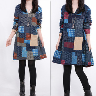 2014秋裝 韓版超大碼長袖打底 碎花拼接休閑女士連衣裙 /