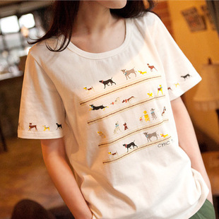 226#日系森女文藝t恤 女上衣 個(gè)性小狗印花短袖T針織衫 一件代發(fā) /