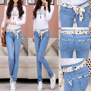 批發(fā)牛仔褲韓版淺色褲子女褲中腰水洗修身 牛仔褲女小腳褲送腰帶 /
