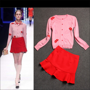 秋季新款歐美大牌女裝 重工刺繡嘴唇羊毛針織長袖上衣半裙套裝 /