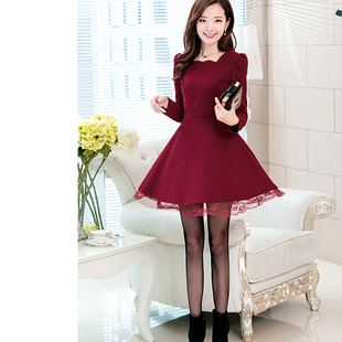 2014秋季韓版圓領(lǐng)長袖針織連裙純色修身打底套頭中腰百褶裙潮 /