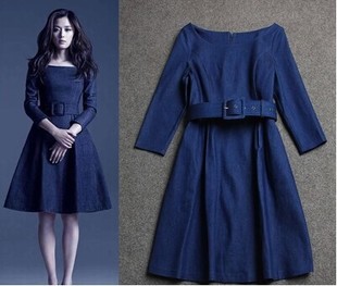 秋季歐洲站圓領(lǐng)皮帶7分袖修身牛仔連衣裙 全智賢明星同款優(yōu)質(zhì)版 /