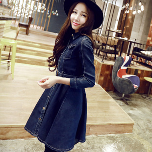 2015春夏新款歐美風(fēng)翻領(lǐng)單排扣襯衫長袖牛仔連衣裙外套女配腰帶 /