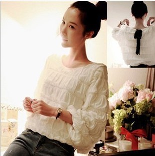 2015秋裝新款后系蝴蝶結(jié)泡泡袖圓領(lǐng)打底衫長袖T恤 /