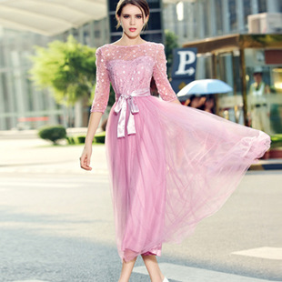 2015夏裝新款淑女中袖網(wǎng)紗刺繡中長款大擺連衣裙 /