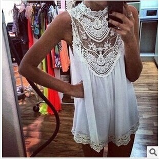 2015外貿(mào)新款 歐美無袖蕾絲花迷你連衣裙性感鏤空短裙 /