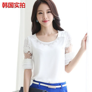 實(shí)拍雪紡衫女2015夏裝新款韓版女裝大碼中袖打底衫女蕾絲衫 /
