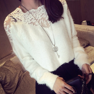 2015秋冬新款韓版蕾絲拼接打底衫女針織衫馬海毛套頭毛衣女百搭潮 /