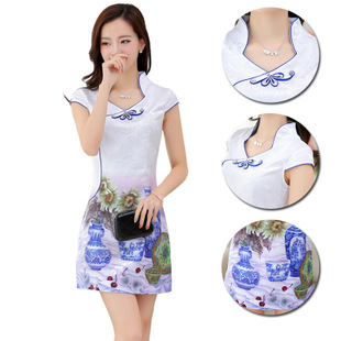 2015新品夏季旗袍連衣裙 短袖修身氣質(zhì)復(fù)古印花改良旗袍裙批發(fā) /