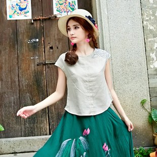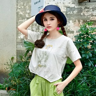 文藝棉麻襯衫繡花夏裝新款白色襯衣短袖打底衫春季女裝上衣 /