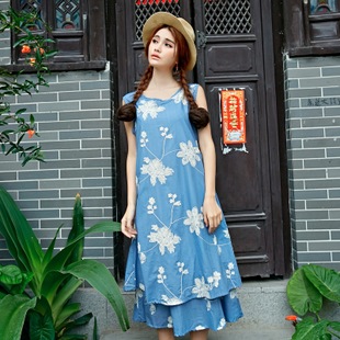 文藝半圓領(lǐng)無袖女連衣裙繡花夏裝新款A(yù)字裙長裙子春季女裝 /