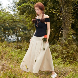 棉麻半身長裙春夏裝新款半身裙子打底A字裙百褶裙女裝 配腰帶 /