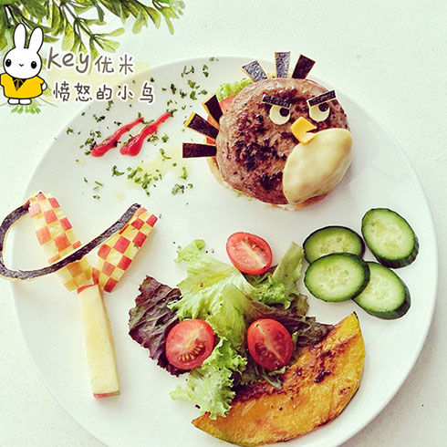 圖片上展示的是key優(yōu)米兒童餐廳的憤怒的小鳥套餐。幾年前,因一款游戲而走紅的憤怒的小鳥如今被搬上了餐桌。key優(yōu)米兒童餐廳將小鳥做成了一個(gè)牛肉餅。惟妙惟肖的造型好不可愛!雞肉、魚肉中肉毒堿和肌氨酸的含量很低,牛肉卻很高。肉毒堿主要用于支持脂肪的新陳代謝,產(chǎn)生支鏈氨基酸,是對(duì)健美運(yùn)動(dòng)員 增長肌肉起重要作用的一種氨基酸。