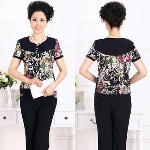2015春夏新款中年女裝 時(shí)尚優(yōu)雅撞色印花媽媽裝 休閑T恤套裝批發(fā) /