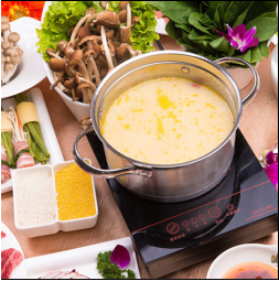 圖片上展示的是半獸人火鍋的金湯鍋。金湯鍋中黃燦燦的鍋底顏色,讓人看了就特別有食欲。濃醇香甜的味道,帶來品質(zhì)生活的極致體驗。半獸人火鍋新鮮衛(wèi)生,采用回轉(zhuǎn)吧臺的流線桌面,傳送帶式自助取菜方式,符合了現(xiàn)代消費者對飲食個性化的需求。半獸人火鍋極具風格的千回百轉(zhuǎn)旋轉(zhuǎn)臺面、自由簡便的搭配吃法,既時尚又新穎健康,已被業(yè)界廣泛認可,成為深受男女老少喜愛的新派小火鍋吃法。美味火鍋,你值得擁有。