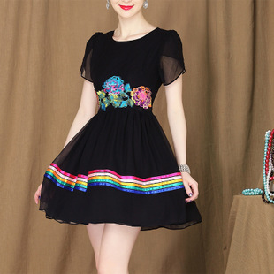 丹慕2014夏裝新款淑女氣質(zhì)彩虹收腰牡丹繡花大擺雪紡連衣裙02627 /