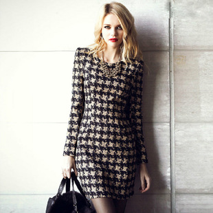 細節(jié)實拍 新款氣質(zhì)修身長袖千鳥格女裝連衣裙顯瘦打底裙女A86 /