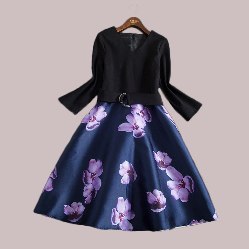 歐美2015秋冬季新款女裝V領(lǐng)七分袖羅馬布拼印花連衣裙配腰帶 /