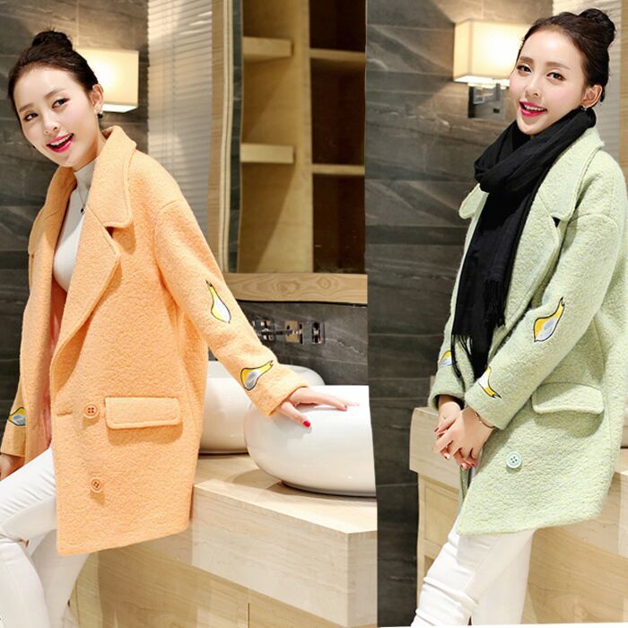 2015韓版毛呢秋冬新款中長款羊毛呢子大衣女雙排扣繡花外套 /