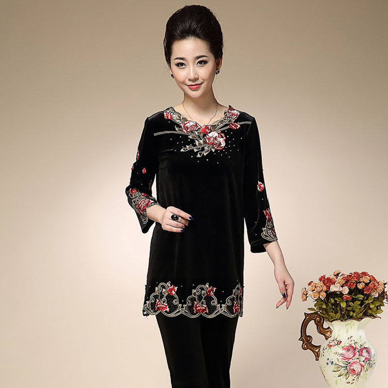 2014秋裝新款加肥加大碼女裝兩件套裝胖媽媽顯瘦絲絨繡花上衣褲 /