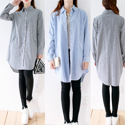 2015秋季新款韓版大碼中長款襯衫豎條紋側(cè)口袋竹節(jié)棉長袖襯衣女 /