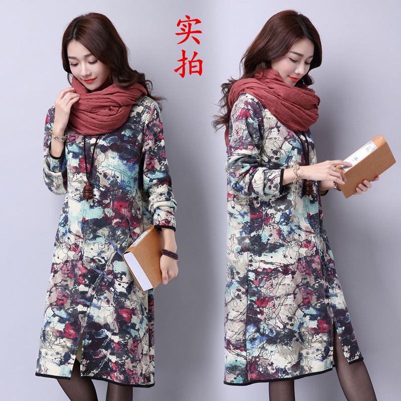 2015新品實拍秋冬韓版大碼女裝加絨加厚印花棉麻長袖連衣裙 /