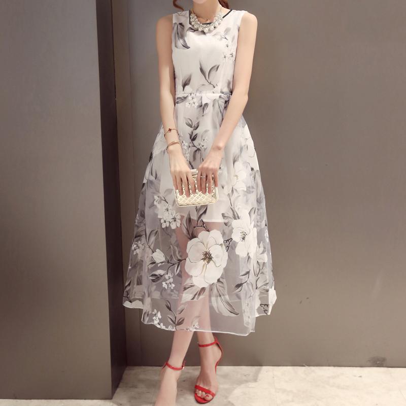 F6524韓版時(shí)尚歐根紗印花圓領(lǐng)收腰連衣裙 夏季氣質(zhì)無(wú)袖仙女長(zhǎng)裙 /
