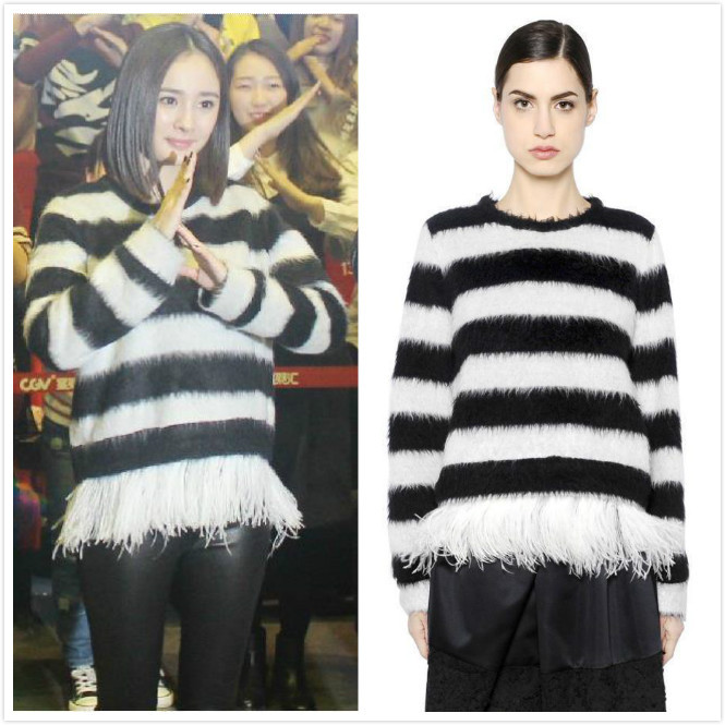 2015秋冬季新款我是證人楊冪同款下擺真羽毛水貂絨毛黑白條紋毛衣 /