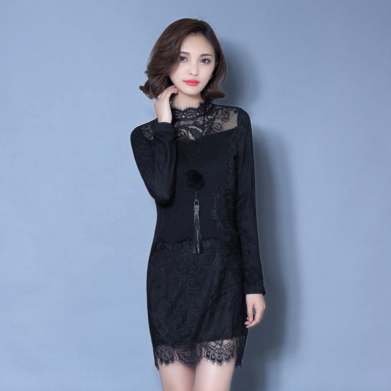 歐洲站2015冬裝新款針織拼接蕾絲立領中長款加絨連衣裙打底裙女 /
