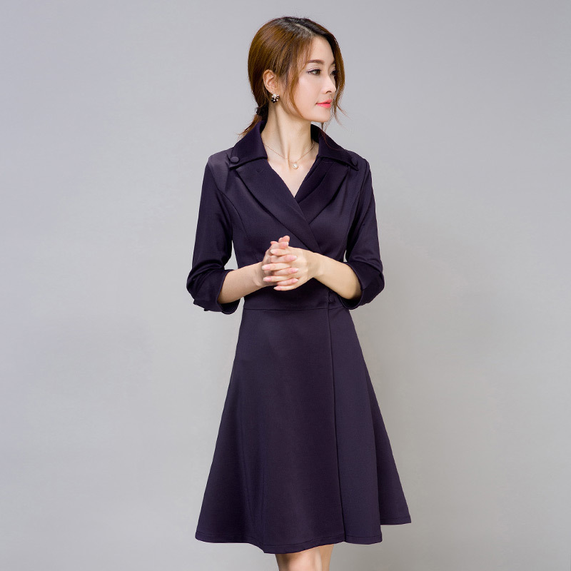 2015秋季新款女裝大碼收腰ol通勤V領(lǐng)修身七分袖連衣裙 /