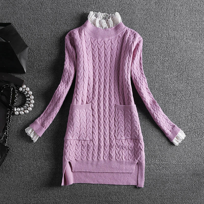 潮秋冬新品韓版純色大口袋修身麻花蕾絲立領(lǐng)中長款針織衫打底衫 /