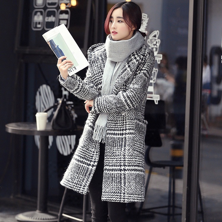 格子羊毛呢子大衣風衣潮女 韓版2015冬季爆款毛呢大衣中長款加厚 /