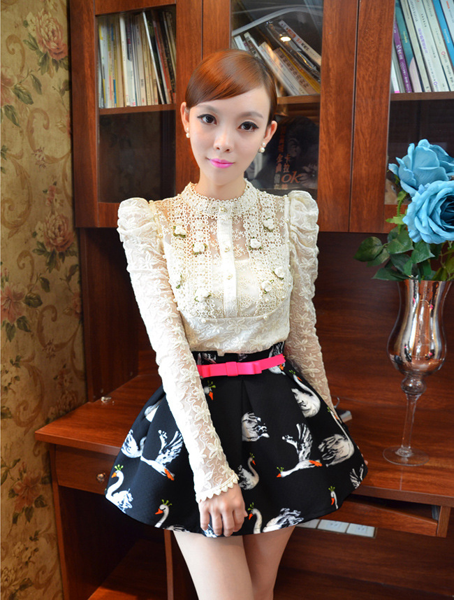 秋冬女裝韓范立領(lǐng)釘珠花朵長袖泡泡袖加絨加厚蕾絲衫 上衣 /