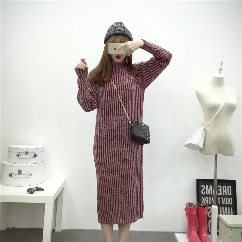 新款中長款針織打底連衣裙毛衣女冬款長袖修身冬裙加厚超長裙子 /