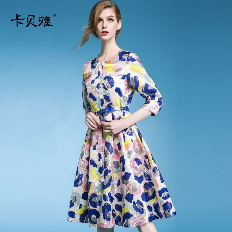 2015早秋新品女裝 圓領(lǐng)優(yōu)雅印花七分袖修身大擺連衣裙女5056 /