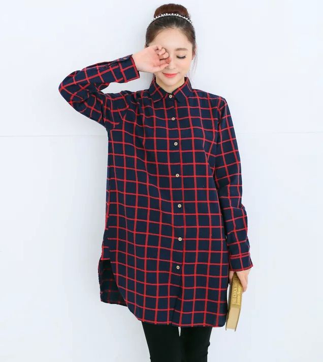 2015新款韓版中長款棉麻長袖大格子襯衫 /