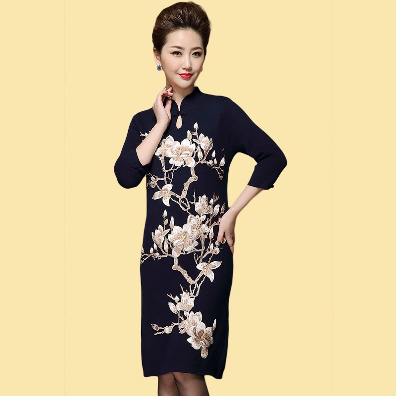 2015秋冬女裝中國民族風(fēng)重工刺繡花針織貂絨旗袍領(lǐng)中長款女連衣裙 /