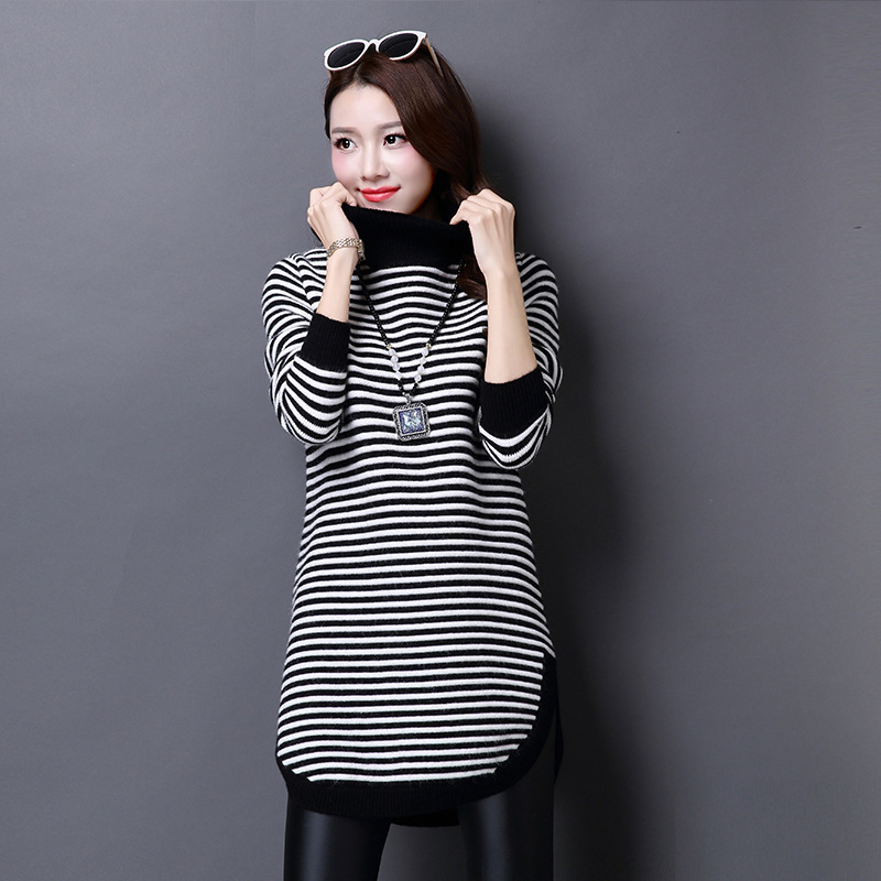 2015年秋冬新款寬松條紋羊毛保暖打底衫針織高領(lǐng)套頭毛衣中長款厚 /
