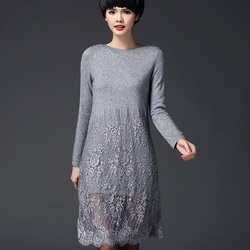 秋冬新品透視蕾絲拼接貂絨毛衣女中長款長袖性感打底針織連衣裙 /