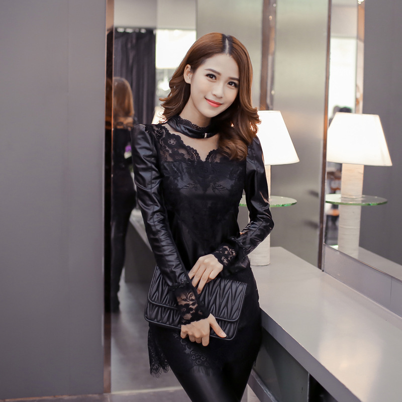 實拍秋裝新款蕾絲PU拼皮中長款高領打底衫大碼加女裝秋冬T恤 /