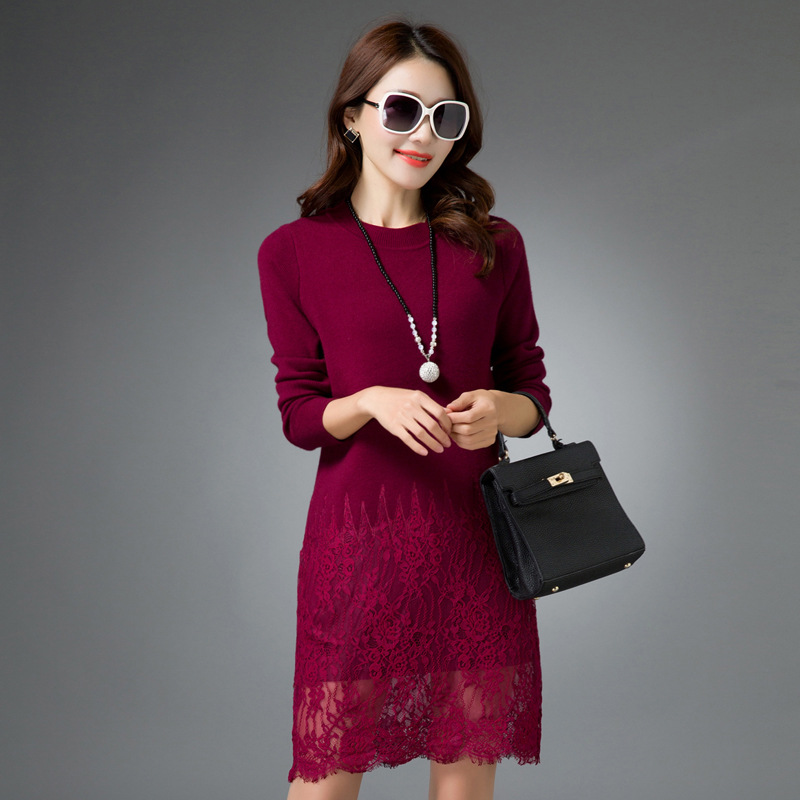 2015秋冬新款韓版怒裝圓領(lǐng)蕾絲下擺長款毛衣寬松大碼針織打底衫 /