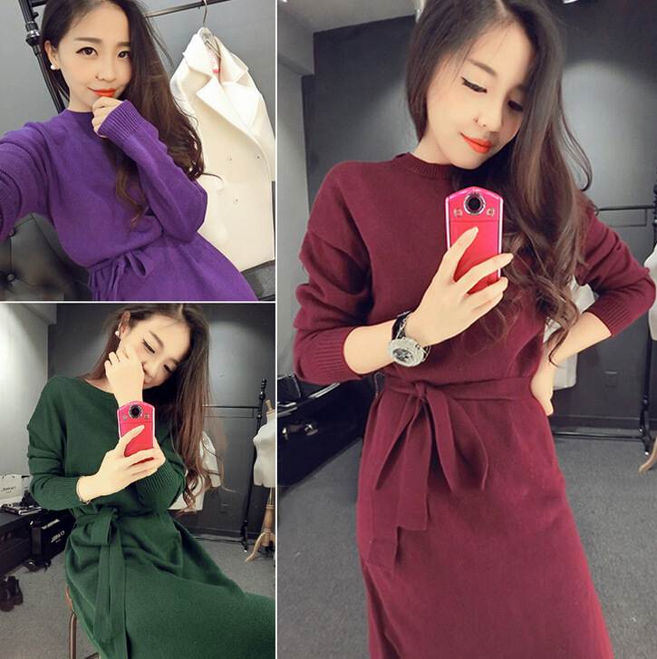 2015秋季新品 韓版百搭純色綁帶側(cè)開(kāi)叉中長(zhǎng)款長(zhǎng)袖針織衫連衣裙女 /