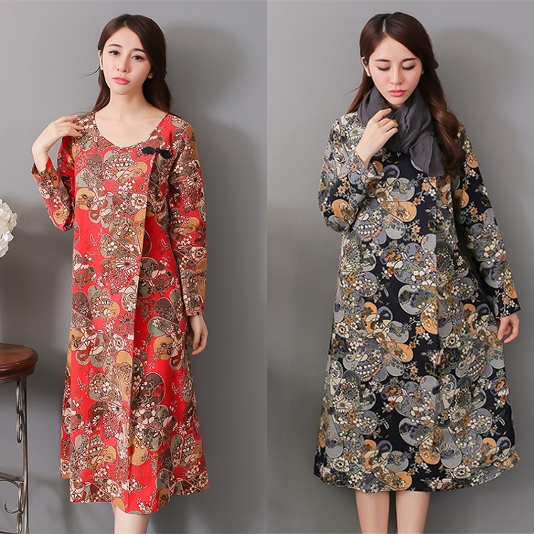實(shí)拍8395 中國民族風(fēng)花好月圓復(fù)古棉麻大碼打底旗袍連衣裙 /